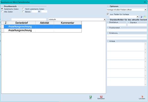 es öffnet sich die Liste für die Projektmaske vorhandene Serienbriefe |