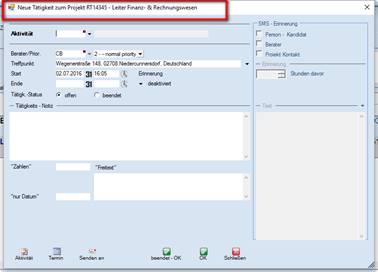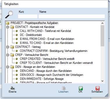 Tätigkeiten (von Kontakten, von Kandidaten) zu diesem Projekt (= erster Eintrag der Auswahlliste), |
