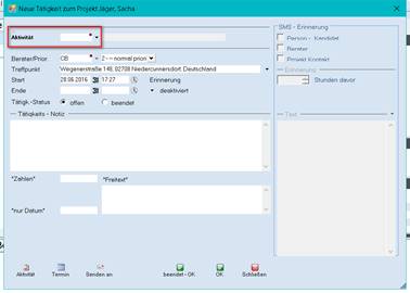 > schnellere Eingabe durch voreingestellte Aktivität / Tätigkeit > > es öffnen sich nur die Tätigkeiten, die vom Administrator in „Interne Einstellungen“ voreingestellten Aktivitätstypen für.. >... -