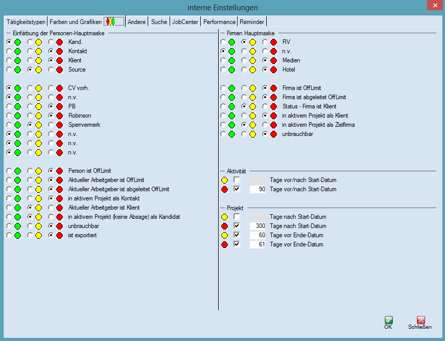 Die Kriterien für die Farben der Ampel werden durch den Administrator konfiguriert. So ist es ihm möglich, je nach Projektstatus oder Unterschreiten des Projektstartes oder Überschreiten des Projektendes die Ampelfarben zu ändern.