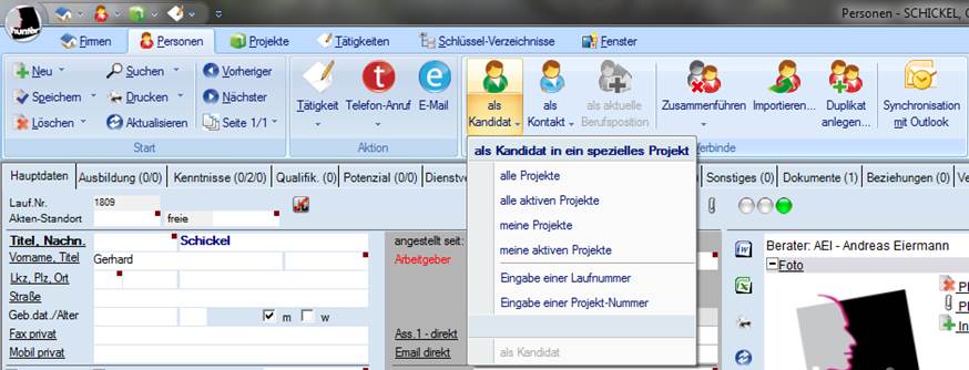 1.       Über die Schaltfläche „als Kandidat“ verbinden Sie eine Person als Kandidat zu einem Projekt. Die Auswahl in welches Projekt der Kandidat verbunden werden soll, unterteilt sich in 6 Gruppen.