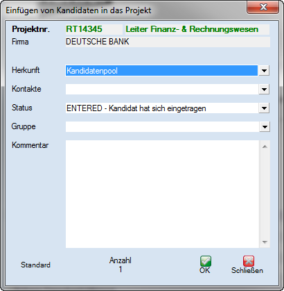 Über dieses Fenster können Sie den Kandidat mit gewissen Voreinstellungen ins Projekt übernehmen: