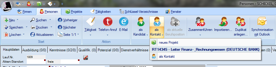 1.       Über die Schaltfläche als Kontakt verbinden Sie eine Person zu einem Projekt als Kontakt. Das Projekt muss entweder im Hintergrund geöffnet sein, oder Sie legen durch diesen Vorgang ein neues Projekt an.