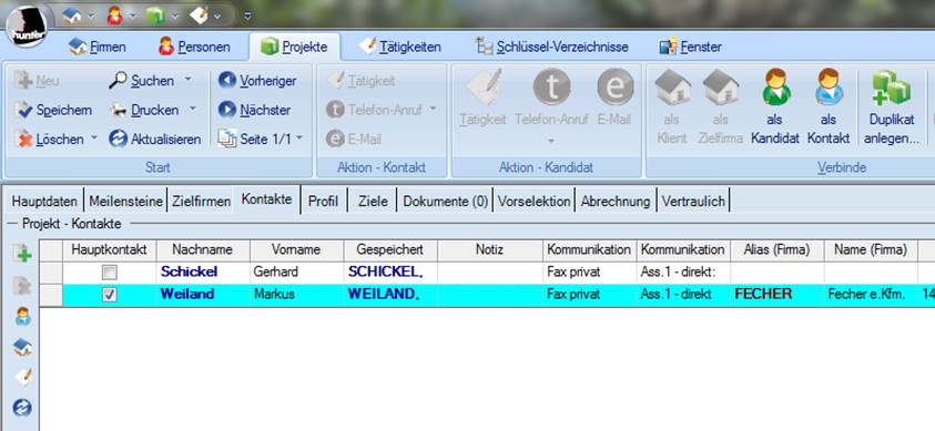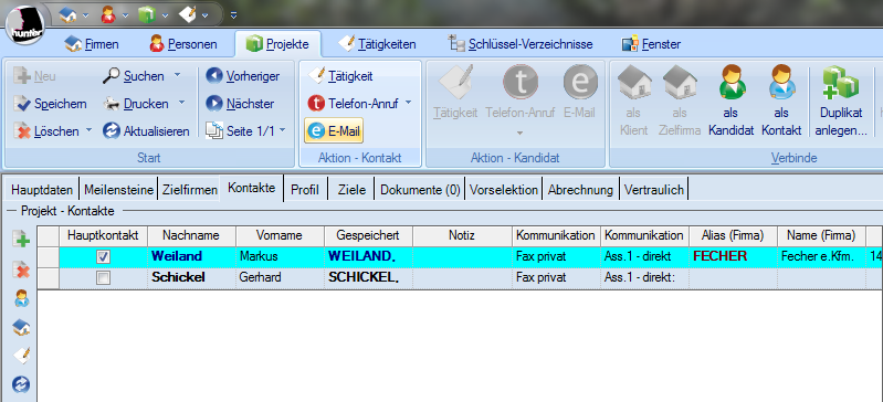 Nun befinden Sie sich wieder im Register Kontakte im Projekt und können weitere Schritte vornehmen.