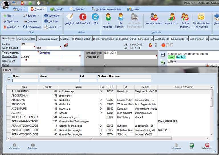 1.       Für diesen Vorgang gibt es zwei verschiedene Möglichkeiten. Entweder Sie haben die entsprechende Firmenmaske im Hintergrund offen, oder Sie geben die Firma bei der Person im Feld Arbeitgeber ein.