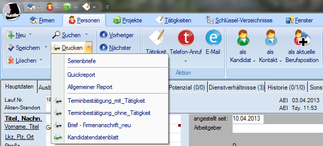 1.       Um einen Serienbrief zu erzeugen, klicken Sie im Ribbonbar unter der Gruppe „Start“ auf „Drucken“. Wenn Sie neben dem Button auf den Pfeil nach unten klicken, können Sie nach Auswahl einen „Quickreport“, „Allgemeiner Report“ oder „Serienbrief“ erstellen. Zudem können Sie auch die zuletzt geöffneten Vorlagen direkt über dieses Menü ausführen (siehe Bild oben).