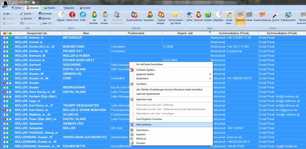 3.       Sie können auch für mehrere Datensätze gleichzeitig einen Serienbrief erzeugen. Dazu werden in der Übersicht mehrere Datensätze markiert - beispielsweise durch Rechtsklick auf die Tabelle und „Alle markieren“ oder mit Strg + linke Maustaste – und anschließend führen Sie über Drucken den Serienbrief aus.