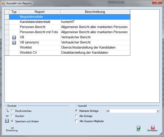 Wählen Sie den entsprechenden Report, die Druckart und die Auswahl. Drucker können Sie unter Einrichtung auswählen und/oder konfigurieren.