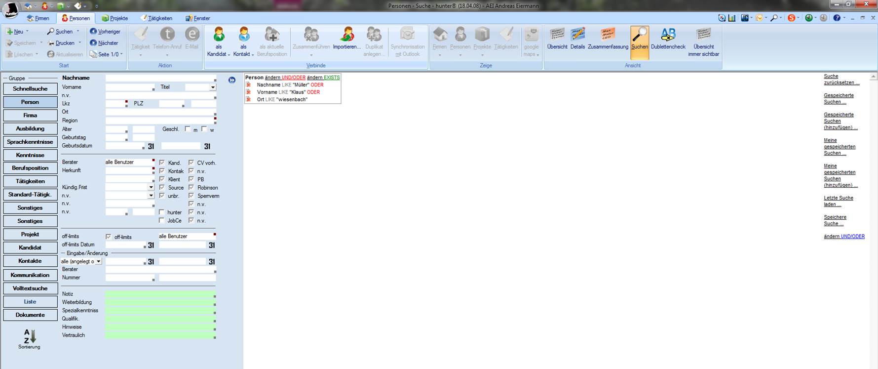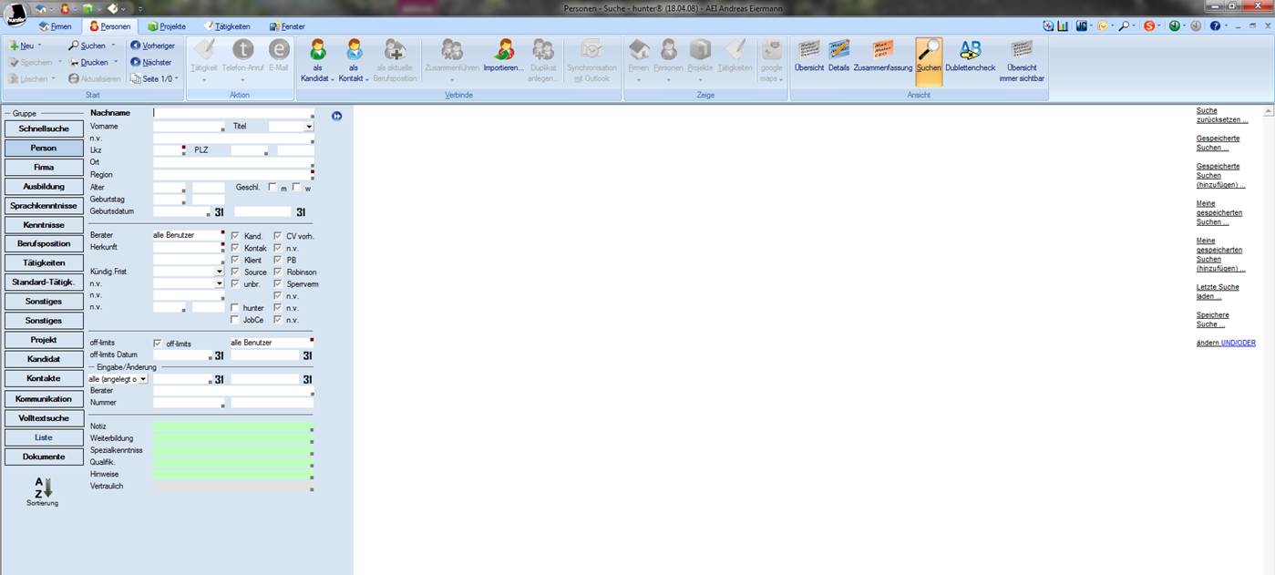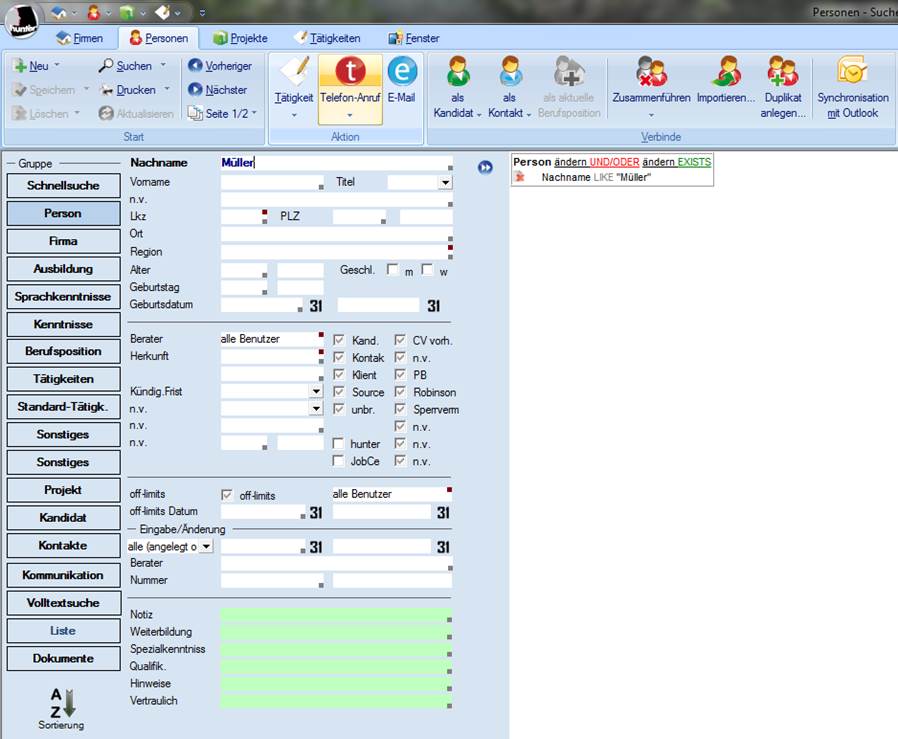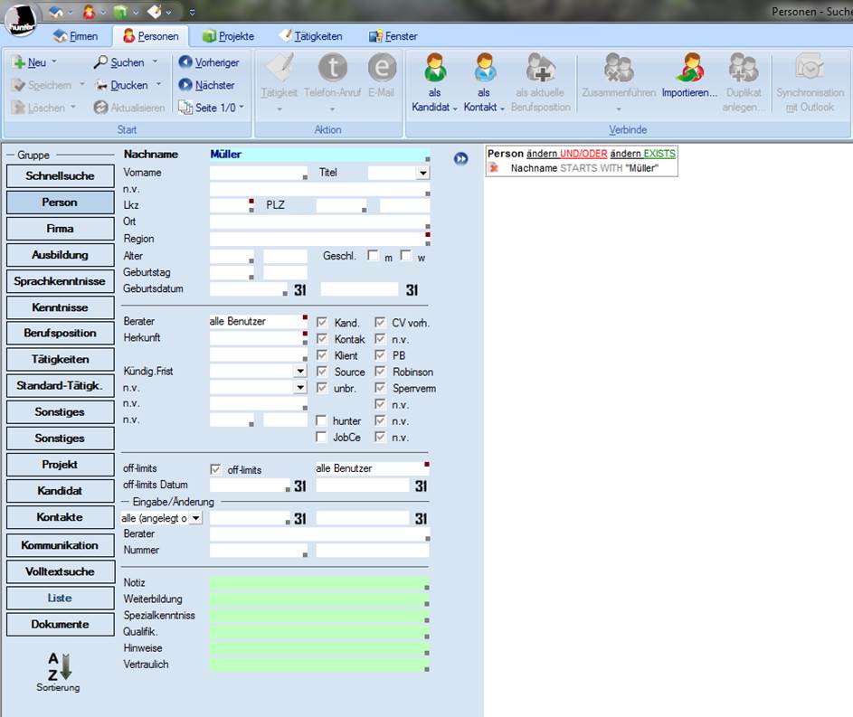 Das Suchfenster bietet Ihnen mit seinem Funktionsumfang alle Möglichkeiten, Daten in der Datenbank zu recherchieren. Je mehr Daten Sie in Ihre Suchkriterien übernehmen, desto qualifiziertere Ergebnisse erhalten Sie aus der Datenbank. Für jede der Hauptmasken gibt es unterschiedliche Suchmasken, die aber alle den gleichen Funktionsumfang bieten. Daher wird dieses Thema ausschließlich anhand der Personenmaske erläutert.