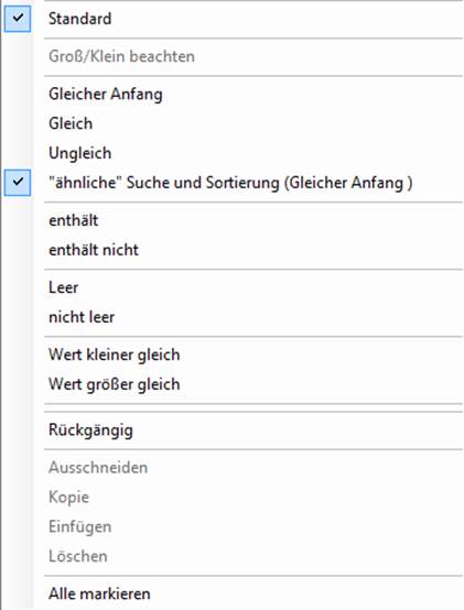 · Standard: Dieser Haken zeigt, dass die Standard Einstellung „ähnliche“ Suche und Sortierung (Gleicher Anfang) gesetzt ist.