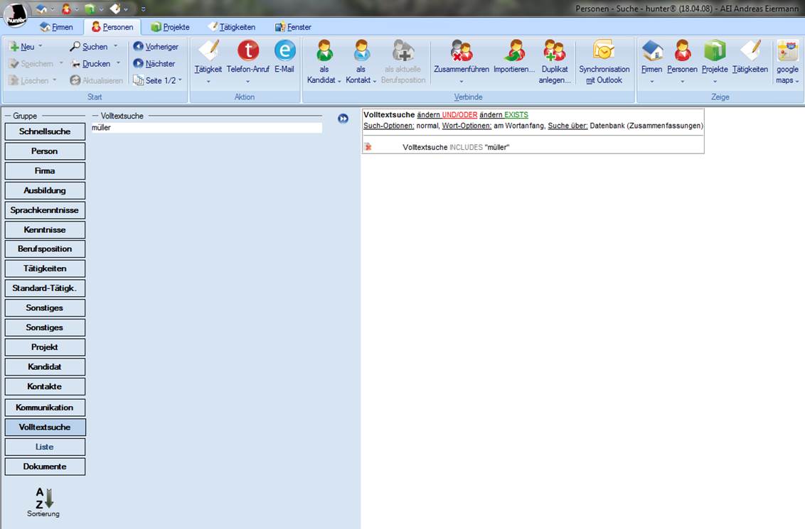 zu meiden, wenn der gesuchte Begriff in einem entsprechenden Feld im hunter steht, welches die normale Suche beinhaltet. Sollten Sie aber keine weiteren Erinnerungen an den Datensatz haben, außer dass etwas Spezielles in einem Notizfeld, oder einem