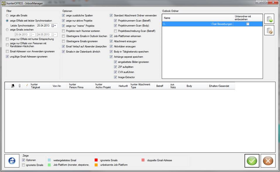 1. In der neuen Version hunter v18 wurden dem Inbox Manager drei weitere Optionen zur Verfügung gestellt. Diese finden Sie im rechten unteren Bereich unter den Optionen.